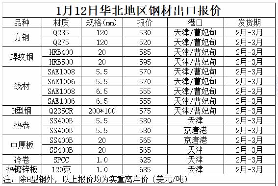 1月12日華北地區(qū)鋼材出口報價參考